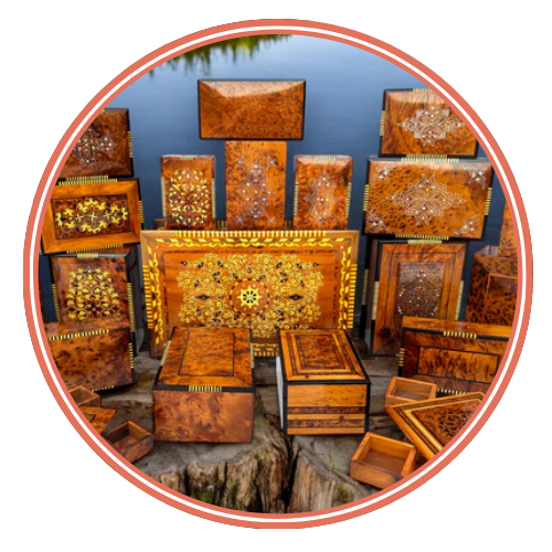 Hand-carved thuya boxes, trays, and décor from Essaouira.